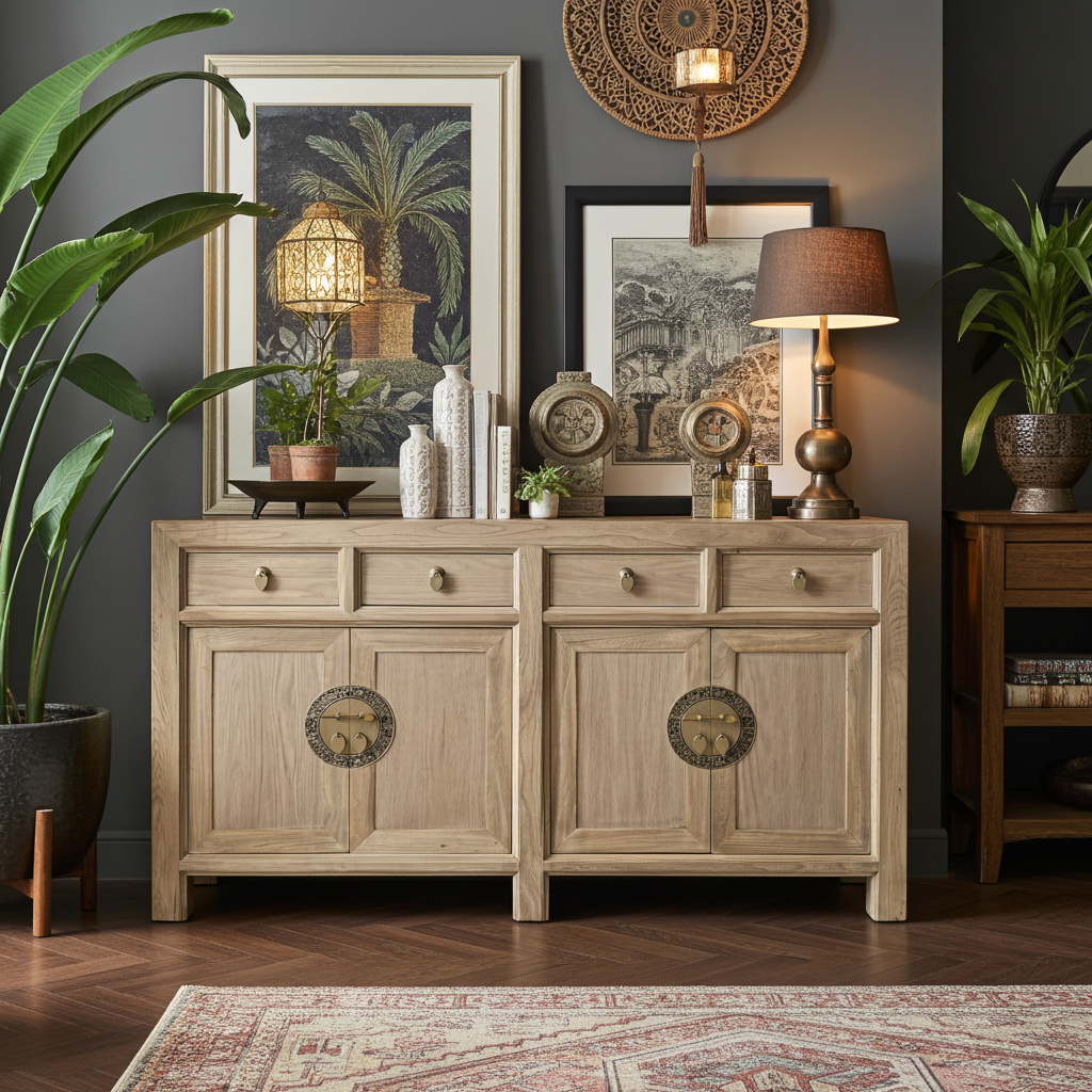 Chinesische Sideboards mit verzierten Messingkreisen, die den chinesischen Tierkreiskalender zeigen, und unserem typisch dezenten, per Hand aufgetragenen Vintage-Look.