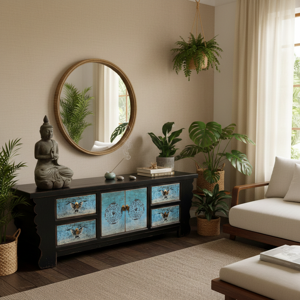 Vintage Asia Asian Lowboard Chest of Drawers Bench Turquoise-Black - Art. 35208-5