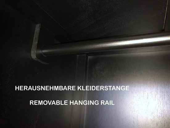 The wardrobe features a large storage space that can be closed with two hinged doors. It also features a removable clothes rail, making it perfect for use as a compact wardrobe. The wedding wardrobe also works great in the hallway as a small guest wardrobe or as a crockery cabinet in the kitchen. Your imagination is almost limitless.