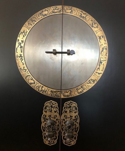 A beautiful Chinese wedding cabinet in understated black with high-quality brass fittings. The large brass circle in the center features stunning, detailed ornaments, such as the Chinese zodiac calendar. This creates the special Asian flair that we strive to imbue with as much of our furniture as possible.