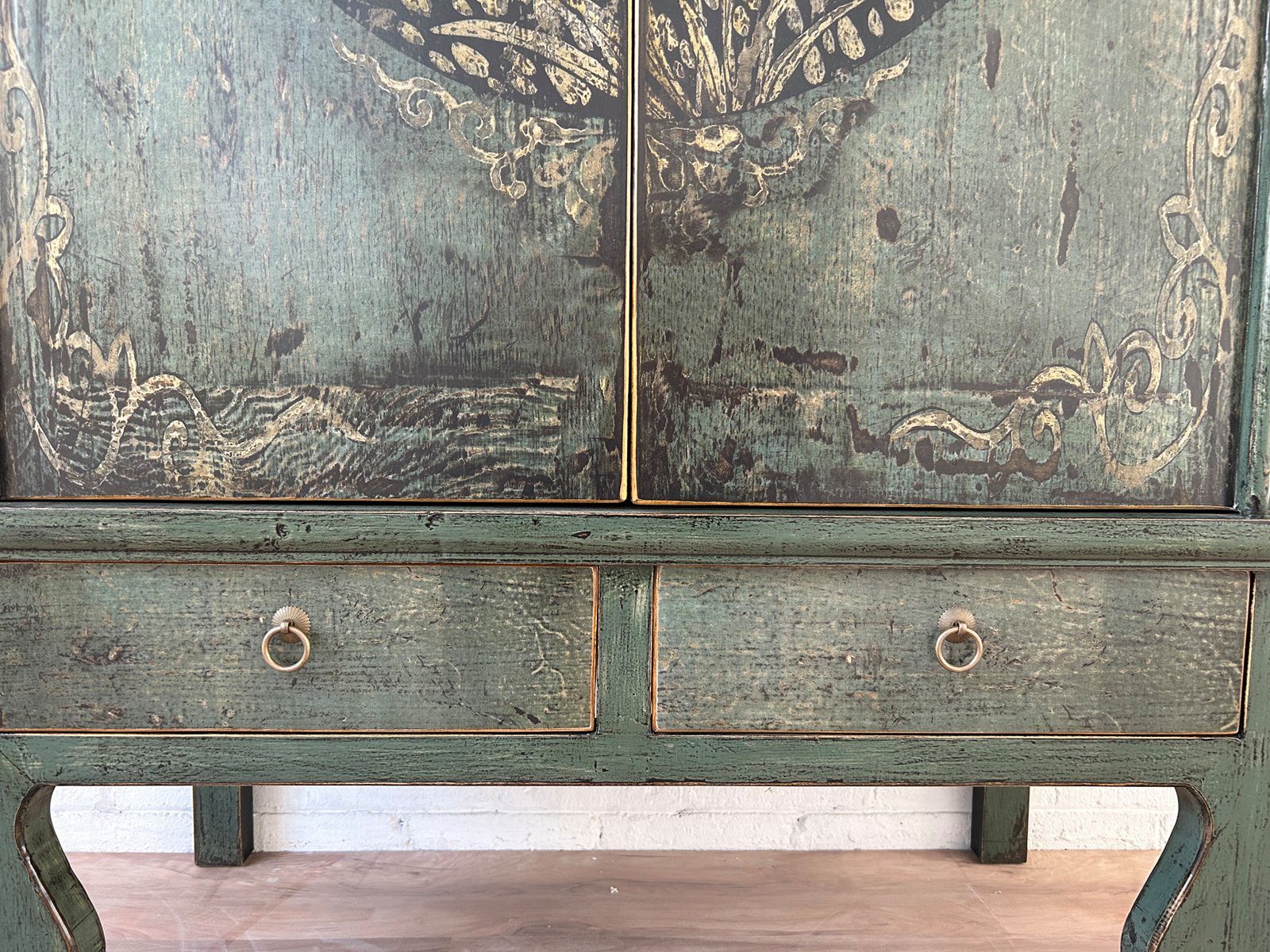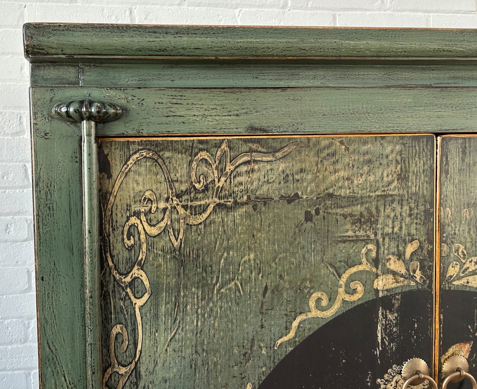 This uniquely beautiful Chinese wedding cabinet, made of poplar wood in fir green, is a true highlight. The circular decoration in the center lends the cabinet its exceptional Asian charm. Its compact dimensions also make it versatile. It features two removable shelves, two drawers, and offers ample storage space.