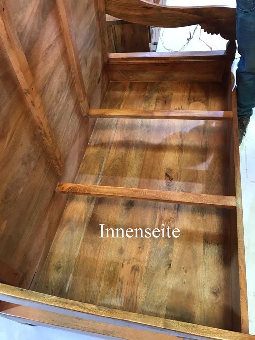 Beautiful daybed made of Indian mango wood that invites you to linger in comfort. It is a solid, stable and yet beautifully decorated piece of furniture that enhances any room with its natural, bright wood look. Perfectly complemented by the numerous cushions and the upholstery in brown and white. The seat can be folded up and offers an unobtrusive, practical storage space underneath.