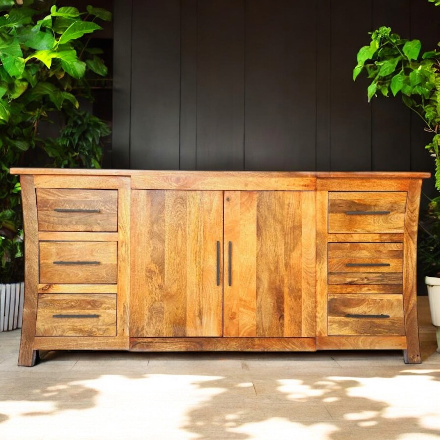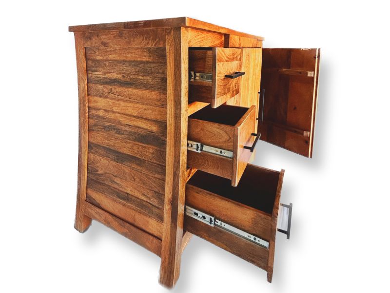 Luxurious mango wood chest of drawers with curved sides from India - authentically made by skilled carpenters in a small family business. The sideboard is as untreated as possible to emphasize the extraordinary natural grain. No natural tropical forests are cut down for our furniture. The wood comes from legal, sustainably managed stocks or has been recycled and reused. Mango wood is a by-product of harvesting mango fruits and is found in equatorial areas such as India, Thailand, the Caribbean and countries in Central and South America. It is therefore a very environmentally friendly and sustainable type of wood that is characterized by stability, durability, density and relative lightness. Mango wood is particularly smooth and hard and, like teak, impresses with its distinctive natural grain and unique color.