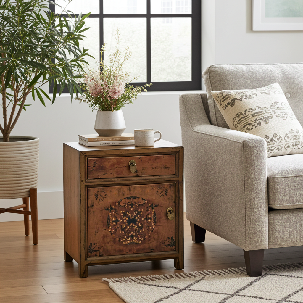 Bonita mesita de noche china de VintageAsia en color marrón. La caja está decorada con motivos florales y adornos. Estos, junto con la combinación de colores, aportan a la pieza ese cierto aire asiático que intentamos insuflar a todos nuestros muebles. Consta de un cajón y espacio de almacenamiento debajo. Puedes dividirlo aún más usando un estante extraíble.