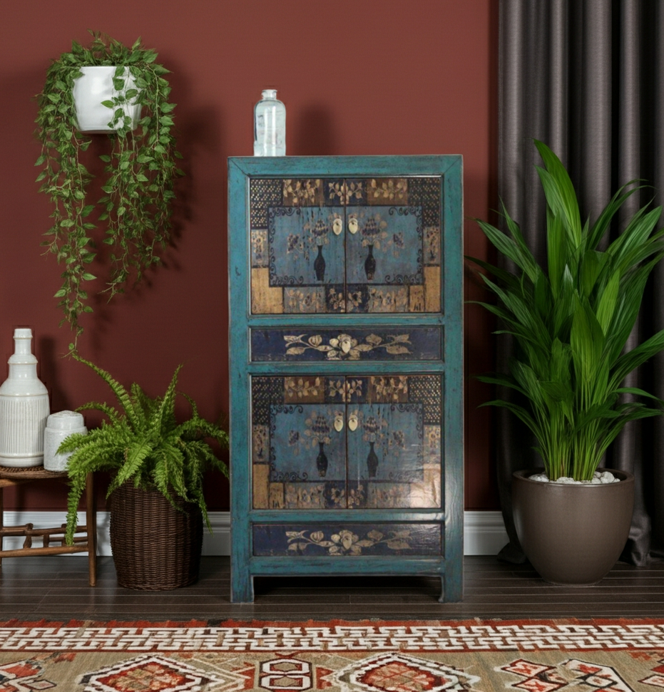 Armario de boda chino de nuestra gama de productos "Oceanflowers" con mucho espacio de almacenamiento y bonitos diseños florales. El armario ofrece mucho espacio gracias a sus dos cajones y a los compartimentos de almacenamiento situados encima. Su tamaño compacto también lo hace versátil. Por ejemplo, como armario para vajilla, como zapatero o como armario adicional en el dormitorio. En cualquier caso, su aspecto lo convierte en un auténtico punto de atracción, aportando clase asiática a cualquier estancia.