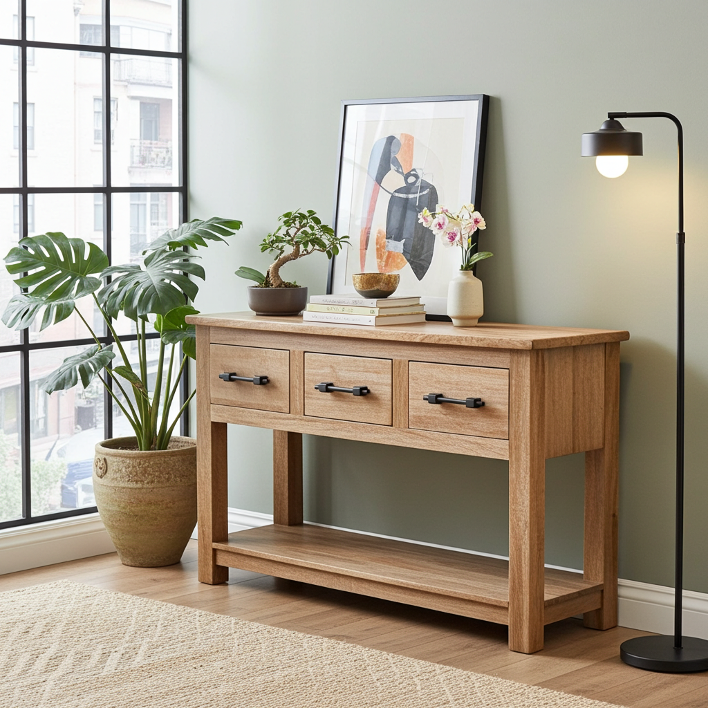 Massive Mangoholz-Konsole aus Indien - authentisch gefertigt in einem kleinen Familienbetrieb in der blauen Stadt Jodhpur. Das Sideboard ist möglichst unbearbeitet, um die natürliche Maserung des Holzes beizubehalten. Für unsere Möbel werden keine Tropenwälder abgeholzt. Das Holz stammt aus legalen, nachhaltig erwirtschafteten Beständen oder wurde recycelt und wiederverwertet. Mangoholz entsteht als Nebenprodukt bei der Ernte von Mangofrüchten und kommt in äquatorialen Gebieten wie Indien, Thailand, der Karibik und Ländern Mittel- und Südamerikas vor. Es ist daher eine sehr umweltfreundliche und nachhaltige Holzart, die sich durch Stabilität, Langlebigkeit, Dichte und relative Leichtigkeit auszeichnet. Mangoholz ist besonders glatt und hart und besticht, ähnlich wie Teakholz, durch eine unverwechselbare natürliche Maserung und einen einzigartigen Farbton.