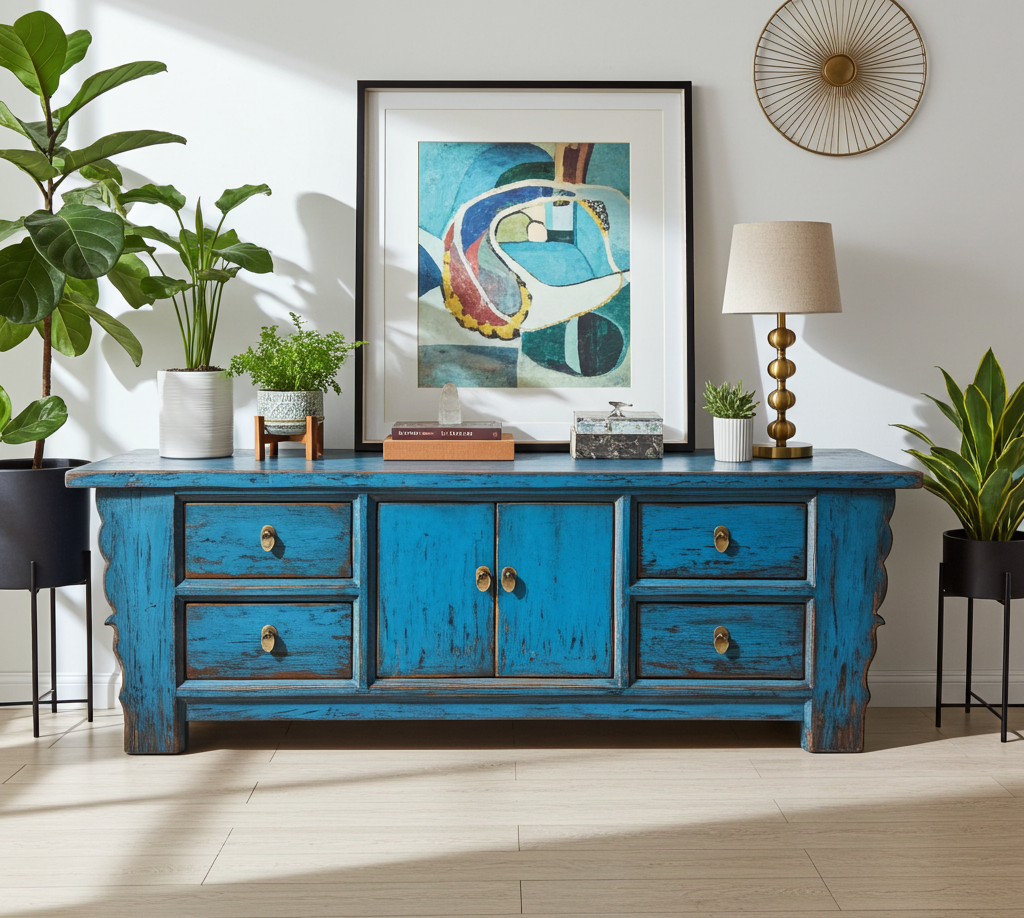 Das Sideboard ist groß und solide. Daher dient es perfekt als TV-Kommode für einen großen Fernseher. Hinzu kommt unser besonderer Vintage-Look. Dafür wurden Kanten und Flächen von Hand so bearbeitet, dass sie den beliebten New-Looks-Old-Stil erhalten.