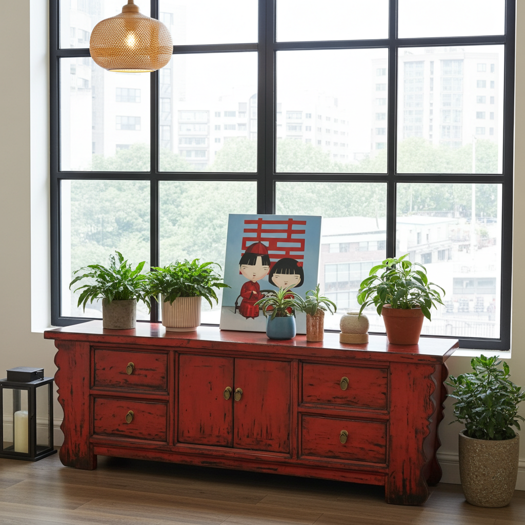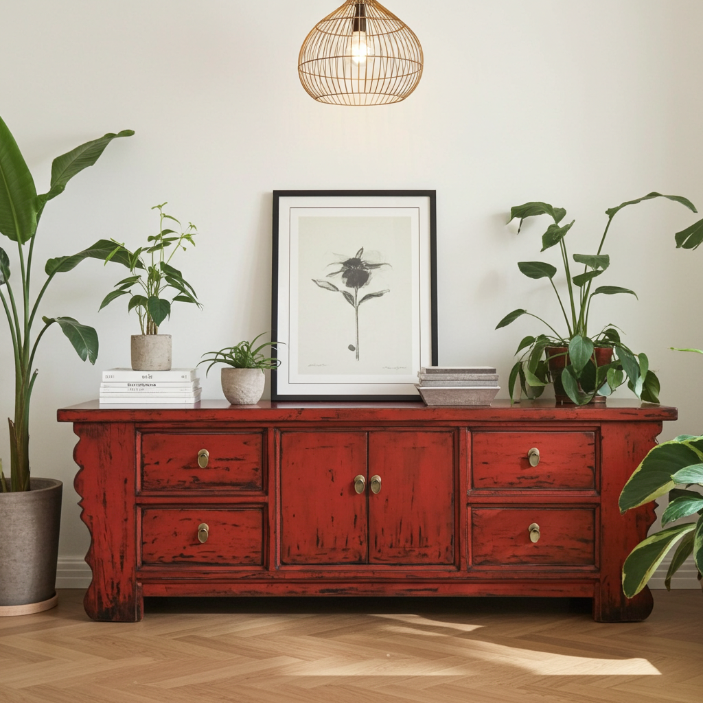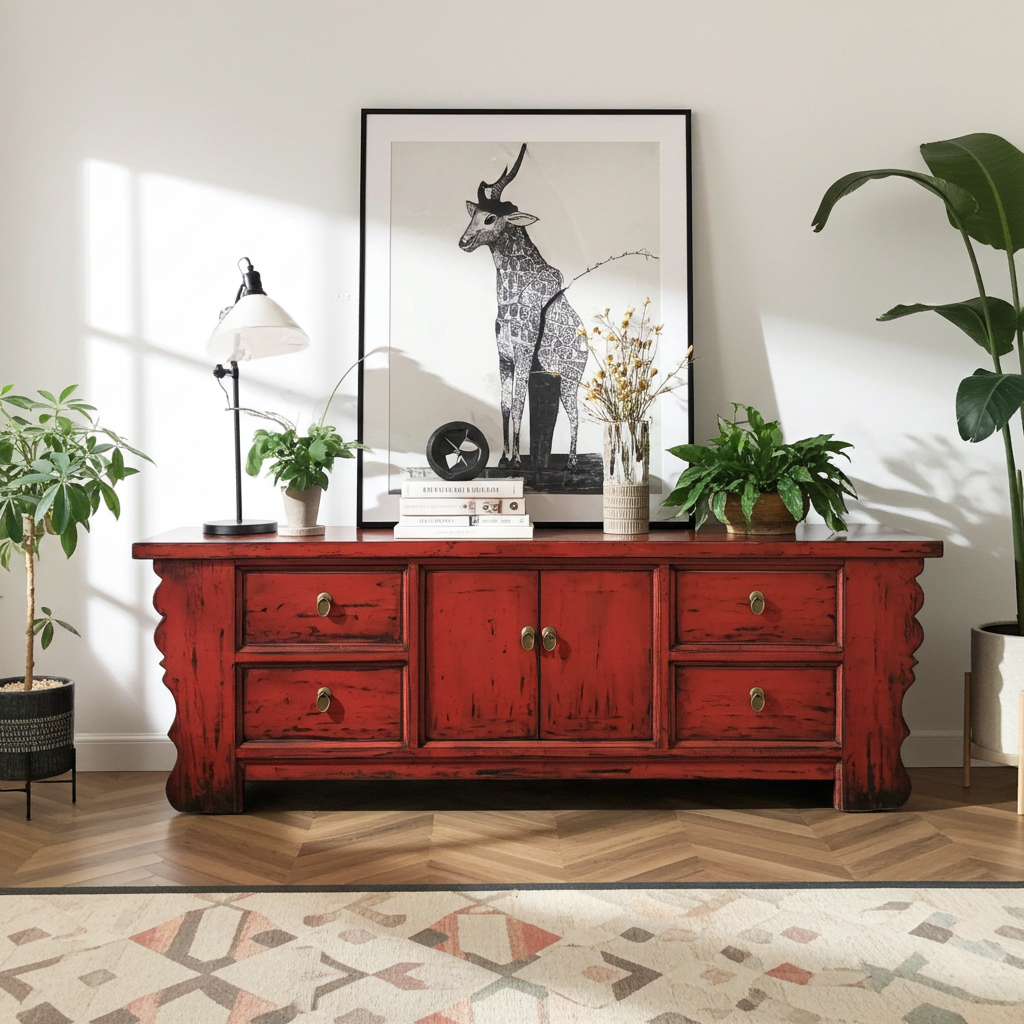 Schmuckvolles chinesisches Lowboard in dekorativem Rot - ein echter Blickfang für jede Wohnung. Das Stück ist mit vier Schubladen und einem größeren Stauraum in der Mitte ausgestattet, der wiederum durch einen herausnehmbaren Regalboden unterteilt ist. Darüber hinaus verfügt es über hochwertige Messinggriffe.