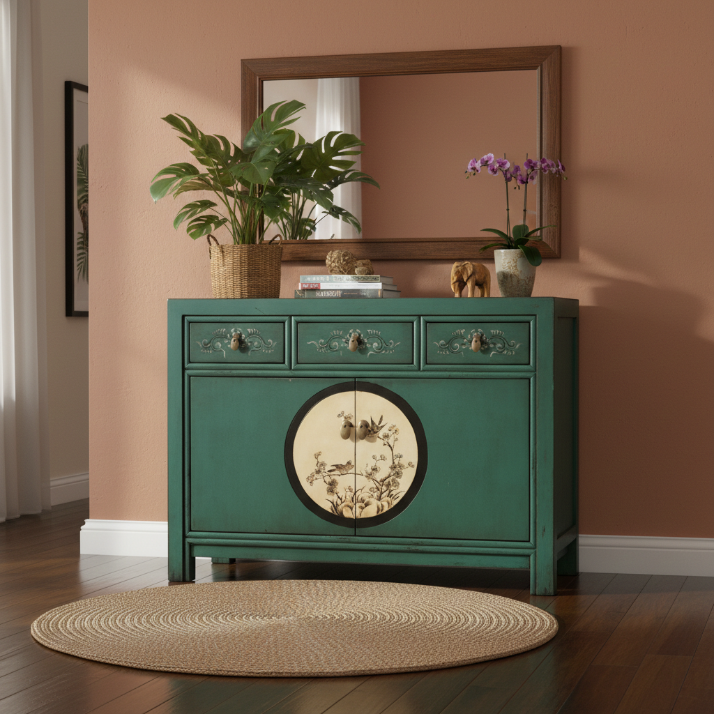 Chinesische Kommode in exotischem Grün. Neben der Farbkomposition beeindrucken vor allem die kunstvollen, per Hand aufgetragenen Verzierungen. Auch bei diesem Sideboard haben wir unsere besondere New-looks-old-Technik eingesetzt. Oberflächen und Kanten wurden aufgeraut und geschliffen, damit sie den begehrten Shabby-Chic-Look erhalten. Insgesamt macht dies diese asiatische Schönheit zu einem ganz besonderen, individuellen Hingucker. Aufgrund seiner eher geringen Größe passt das Stück problemlos in jeden Raum.