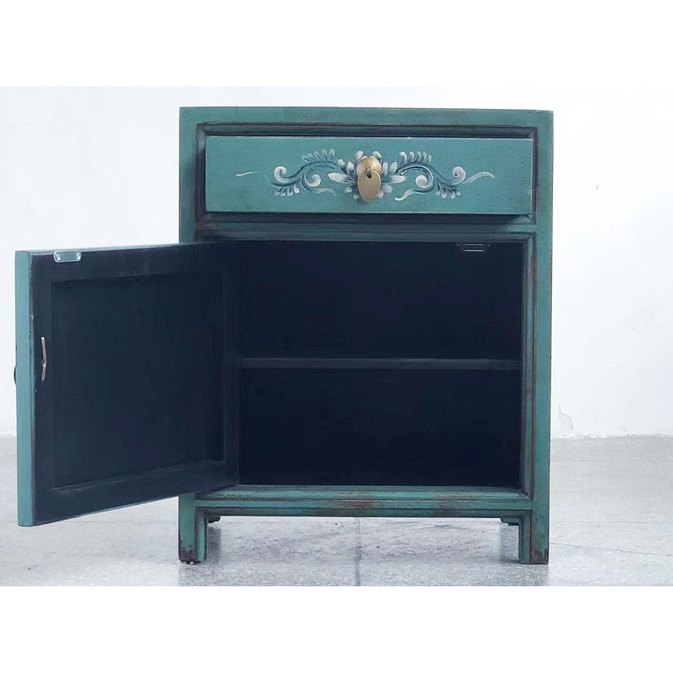 Schmuckvoller chinesischer Nachttisch in Grün und Beige aus unserer Produktreihe "Aurora". Das Kästchen ist mit floralen Mustern und Ornamenten verziert. Diese verleihen dem Stück zusammen mit der Farbgebung das gewisse asiatische Ambiente, das wir versuchen allen unseren Möbeln einzuhauchen. Es besteht aus einer Schublade und einem Stauraum darunter. Diesen können Sie durch einen herausnehmbaren Einlegeboden nochmals unterteilen.