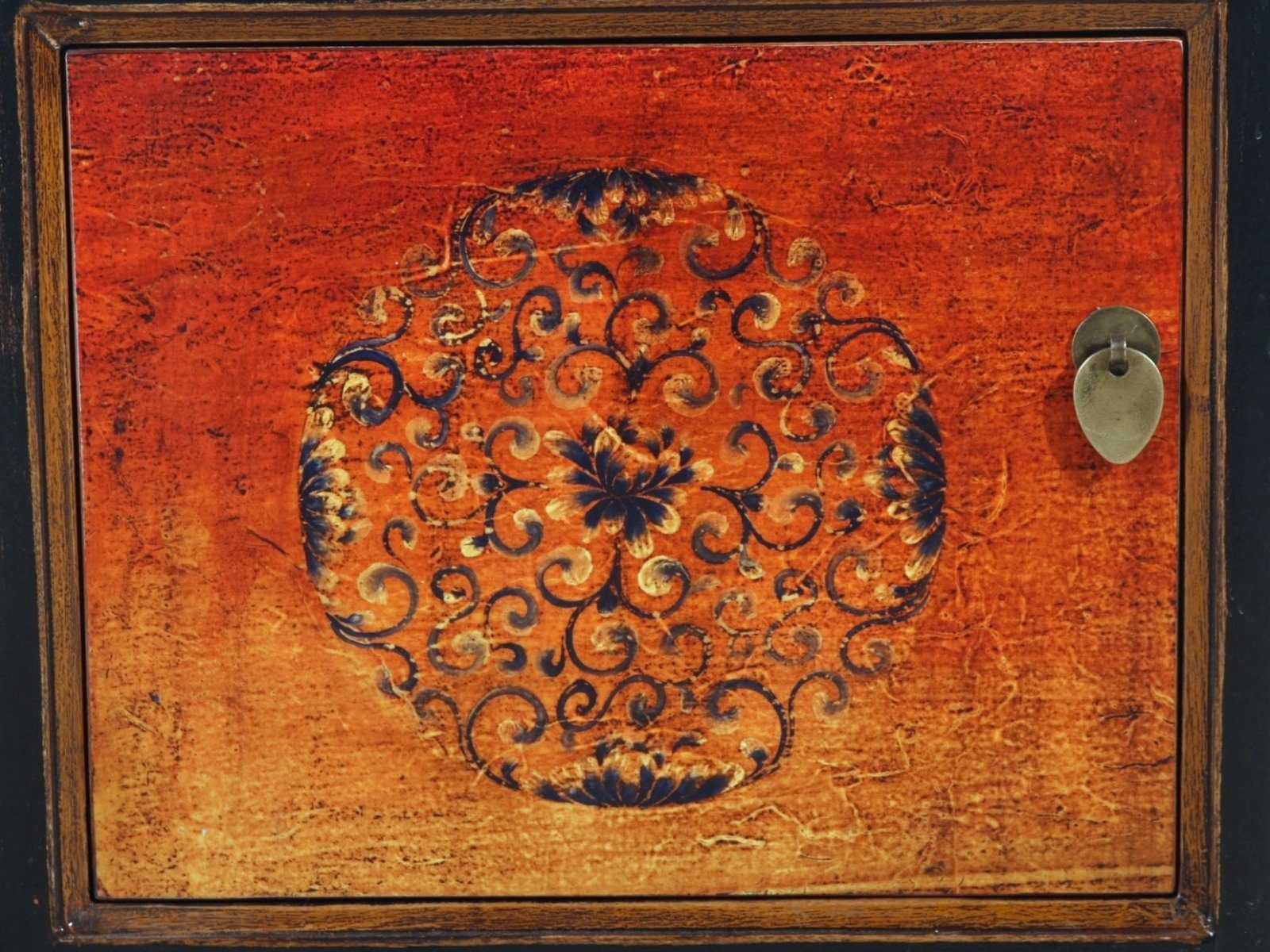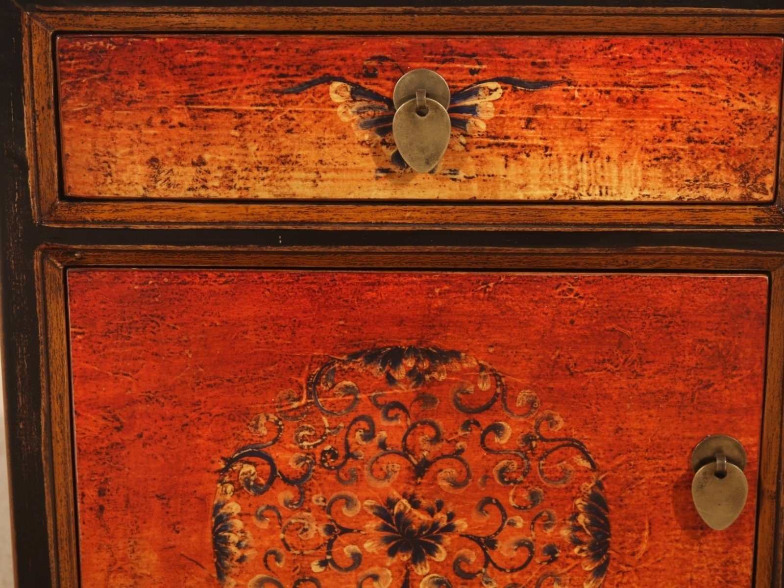 Hübscher chinesischer Nachttisch in feurigem Orange aus unserer Produktreihe "Fire". Das Kästchen ist mit floralen Mustern und Ornamenten verziert. Diese verleihen dem Stück zusammen mit der Farbgebung das gewisse asiatische Ambiente, das wir versuchen allen unseren Möbeln einzuhauchen. Es besteht aus einer Schublade und einem Stauraum darunter. Diesen können Sie durch einen herausnehmbaren Einlegeboden nochmals unterteilen.
