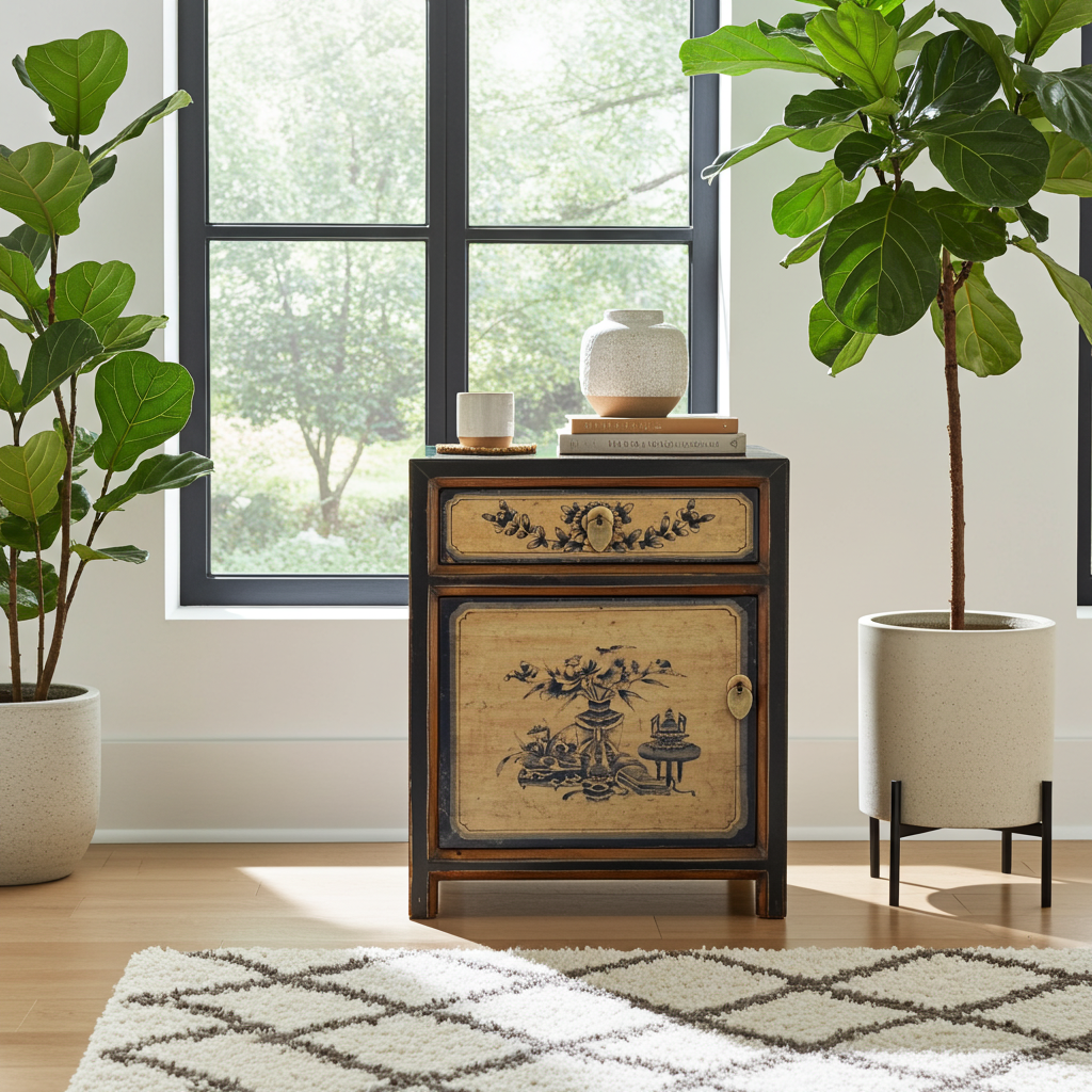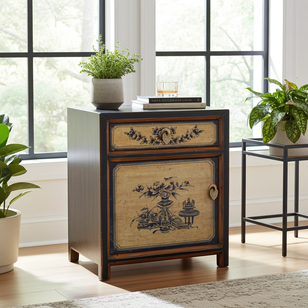 Hübscher chinesischer Nachttisch in Beige und Schwarz. Das Kästchen ist mit floralen Mustern und Ornamenten verziert. Diese verleihen dem Stück zusammen mit der Farbgebung das gewisse asiatische Ambiente, das wir versuchen allen unseren Möbeln einzuhauchen. Es besteht aus einer Schublade und einem Stauraum darunter. Diesen können Sie durch einen herausnehmbaren Einlegeboden nochmals unterteilen.