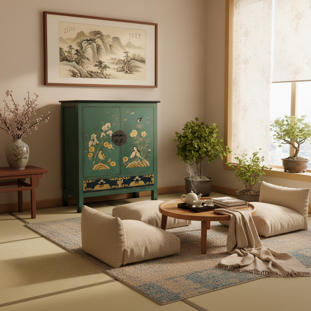 Vintage Asia Exotisches Highboard Schrank Grün Blau - Art. 2025-1