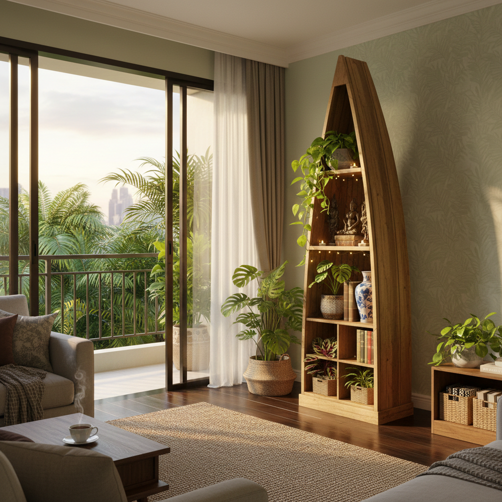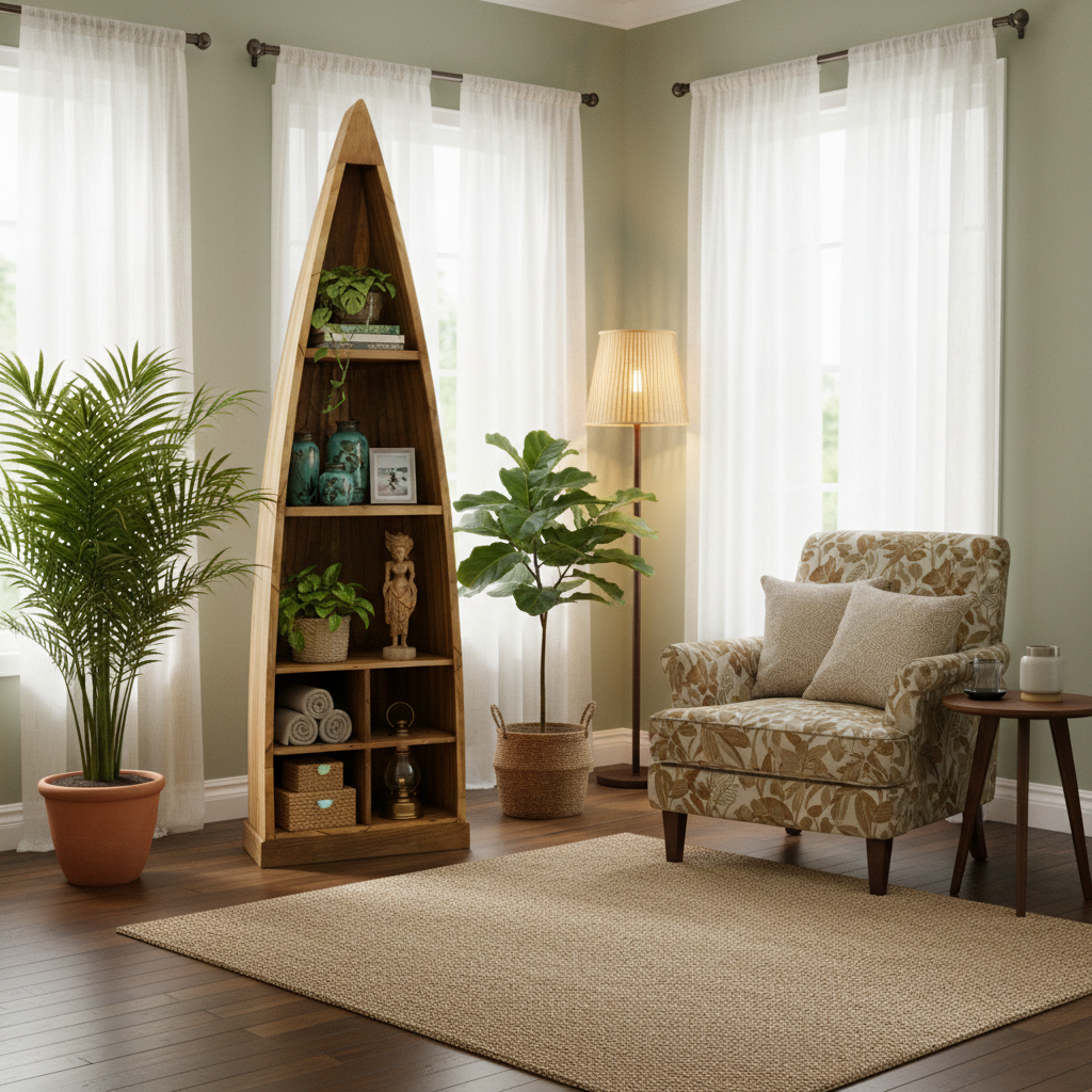 Unverwechselbares Magoholz-Regal aus Indien in Form eines Boots. Super geeignet etwa als Bücherboard, Eckregal, Wandregal oder Raumteiler. Tolle Form in asiatischem Design mit Fächern und Regalflächen. Gefertigt von einem kleinen, uns gut bekannten Familienbetrieb in der blauen Stadt Jodhpur im indischen Bundestaat Rajasthan.