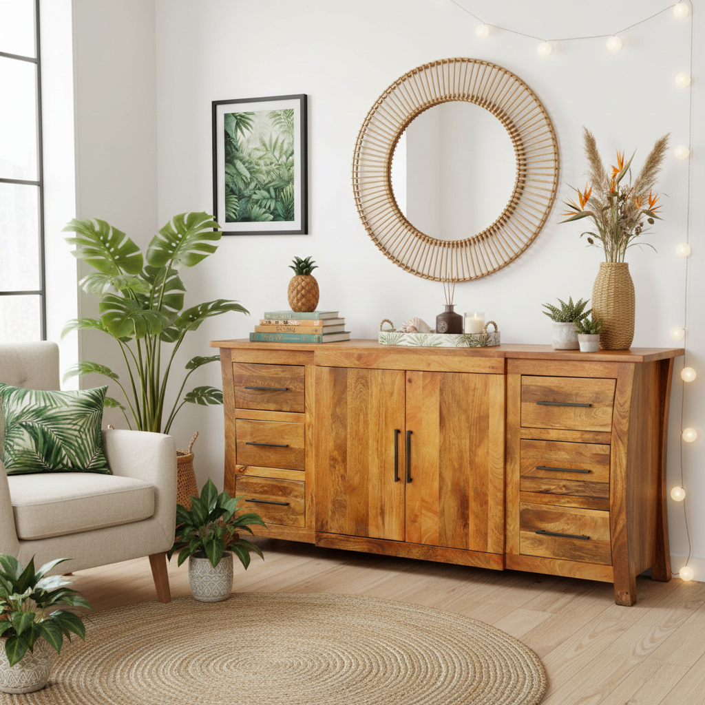 Luxuriöse Mangoholz-Kommode mit gebogenen Seiten aus Indien - authentisch gefertigt von versierten Schreinern in einem kleinen Familienbetrieb. Das Sideboard ist möglichst unbearbeitet, um die außergewöhnliche natürliche Maserung zu betonen. Für unsere Möbel werden keine natürlichen Tropenwälder abgeholzt. Das Holz stammt aus legalen, nachhaltig erwirtschafteten Beständen oder wurde recycelt und wiederverwertet. Mangoholz entsteht als Nebenprodukt bei der Ernte von Mangofrüchten und kommt in äquatorialen Gebieten wie Indien, Thailand, der Karibik und Ländern Mittel- und Südamerikas vor. Es ist daher eine sehr umweltfreundliche und nachhaltige Holzart, die sich durch Stabilität, Langlebigkeit, Dichte und relative Leichtigkeit auszeichnet. Mangoholz ist besonders glatt und hart und besticht, ähnlich wie Teakholz, durch eine unverwechselbare natürliche Maserung und einen einzigartigen Farbton.